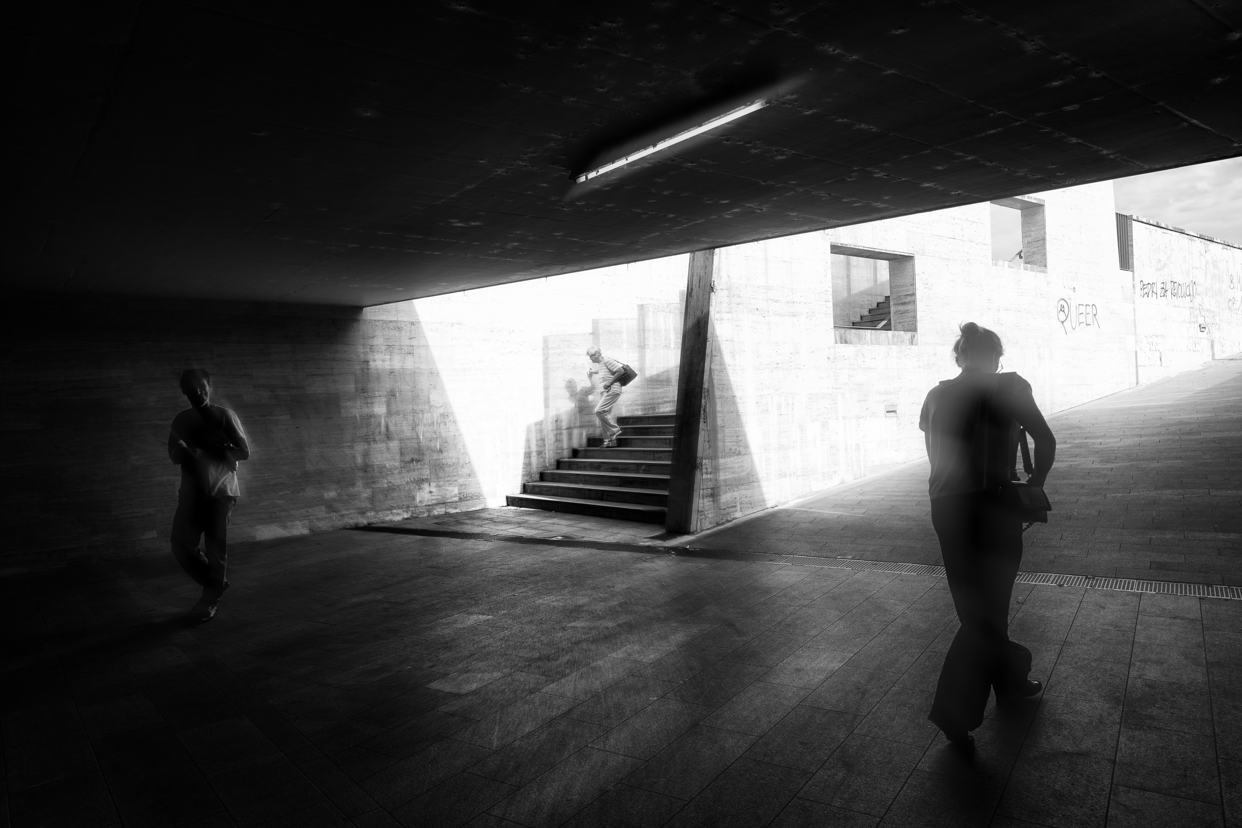 There is often a certain order to my photographs, which is one of the criteria I follow. I don't like scenes where objects or subjects overlap or the frame is chaotic; instead I prefer minimalism with fewer elements that form a structured composition. Accordingly, I try to find a clean, geometrically precise, perhaps architecturally interesting background and wait for something to happen. Sometimes a single passerby is enough, sometimes it's something more.How do you choose these moments?